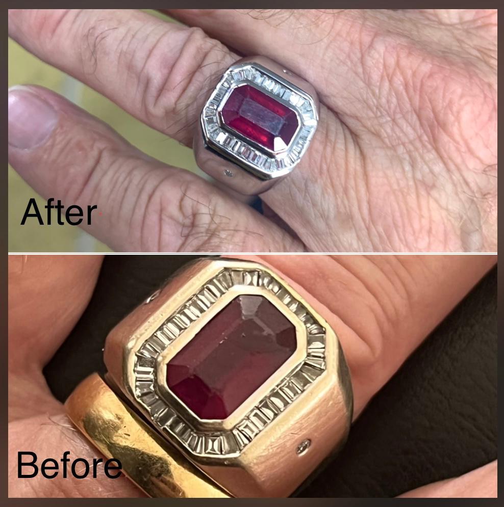Ring sizing, soldering, claw work, stone replacement, laser welding for delicate pieces, polishing/rhodium finishing, and full restorations, including pearl restringing.
